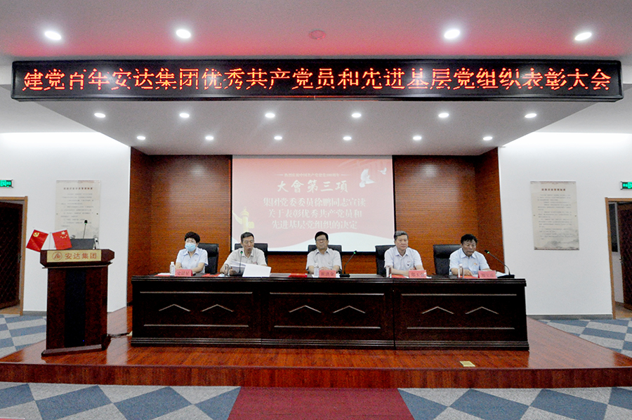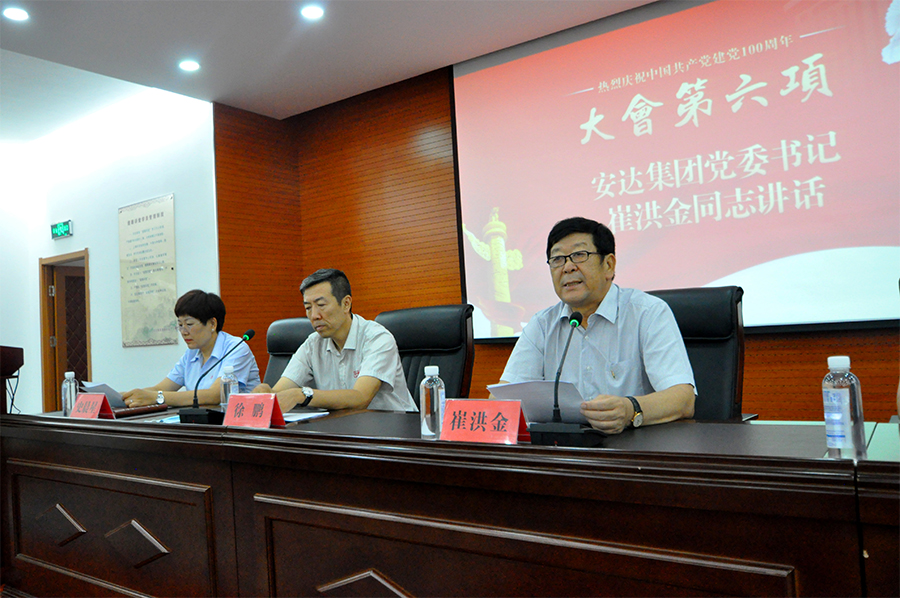 随后,召开建党百年•安达集团优秀共产党员和先进基层党组织表彰大会。大会在雄壮的国歌声中拉开帷幕,根据会议议程集团党委委员徐鹏同志宣读《关于表彰优秀共产党员和先进基层党组织的决定》;集团党委书记崔洪金和党委委员徐鹏、郑玉强、郑宝彦、史晨星为优秀共产党员和先进基层党组织颁奖;第一党支部何秀翠、第二党支部刘东旺两名同志作为先进代表作大会发言;集团党委书记、董事长崔洪金同志作重要讲话,并领誓重温入党誓词。最后在高唱《没有共产党就没有新中国》中落下帷幕。