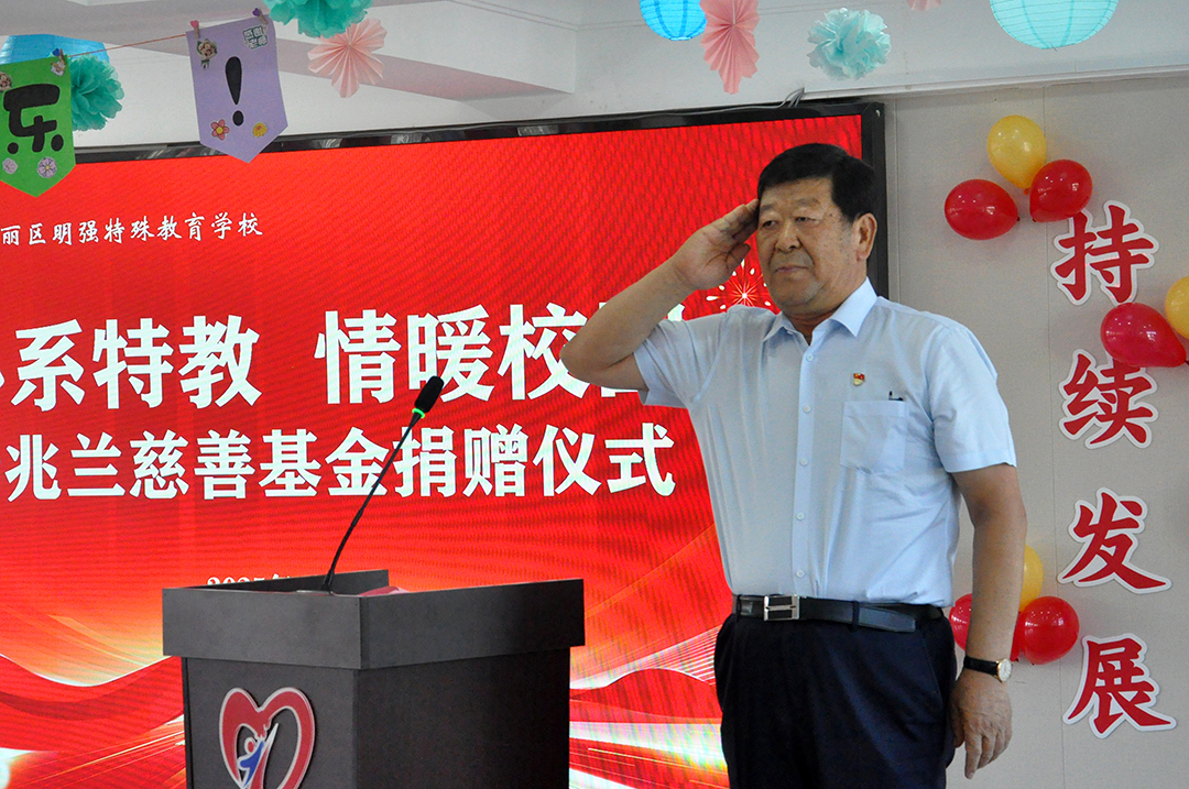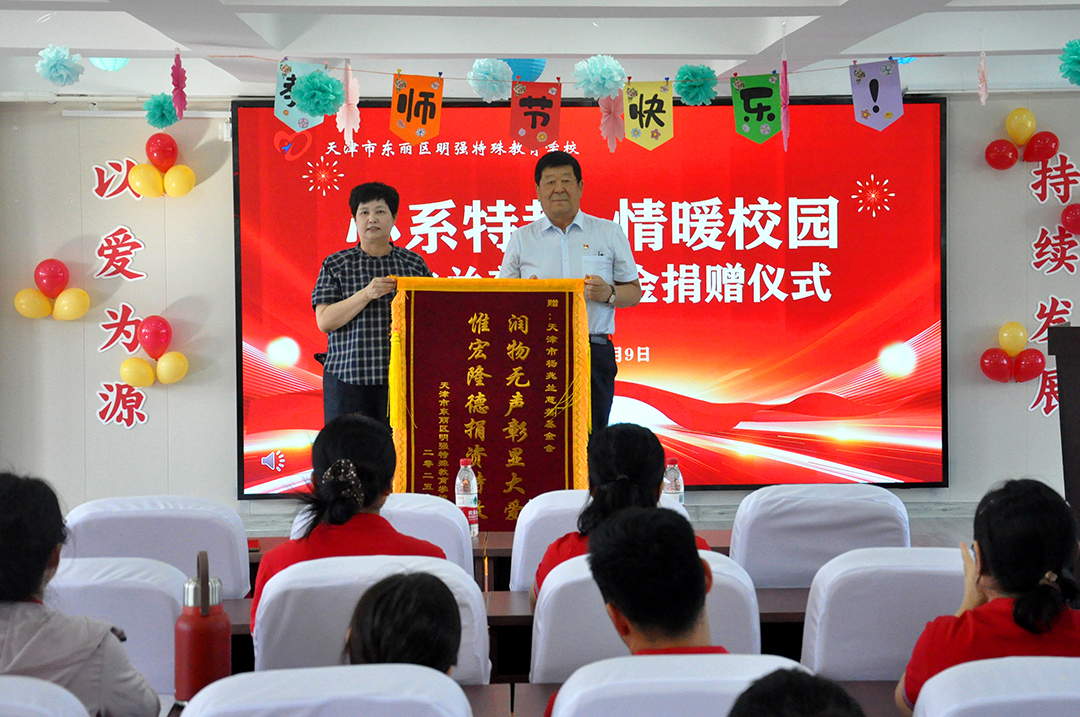 随后的捐赠仪式上,崔洪金代表天津市杨兆兰慈善基金会,将 10 万元教师专项改善资金交付明强特殊教育学校校长尚俊歆手上。尚校长表示该笔资金将精准用于教师发展基金,支持教师参与特教专业培训、教研交流活动,为教师成长赋能。为表感谢,尚校长向崔洪金董事长赠送锦旗。